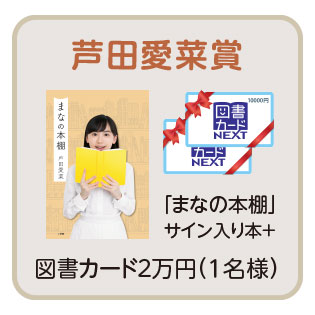| 芦田愛菜賞 | 「まなの本棚」サイン入り本+ 図書カード2万円 1名様 |