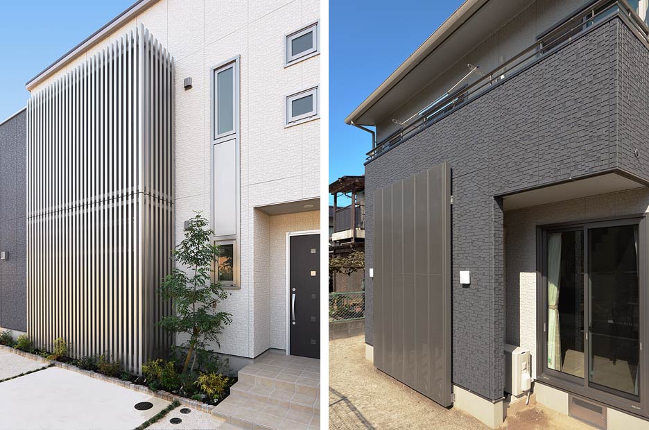 玄関のある建物の正面側は北向きのため、水廻りを中心にレイアウトして、外壁はアルミルーバーで広く覆いました。 これにより室内のプライバシーに配慮すると同時に、外観のシャープな印象を演出しています。隣地に面する南側のリビングは窓の外側にパンチングパネルを設置。 外からの視線を遮り、室内の視界・日射・通風を確保しました。