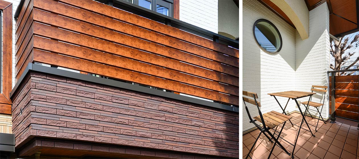 外観のアクセントとして、陽光を浴びて立体的に浮かび上がる石調タイルやバルコニーの木調化粧格子を取り入れ、ナチュラルなスタイルにまとめました。 2階リビングに面して設けたバルコニーは、奥のコーナーを広めに確保。暖かい季節にはお茶を飲んだり、お子さまを遊ばせたりするスペースとして最適です。