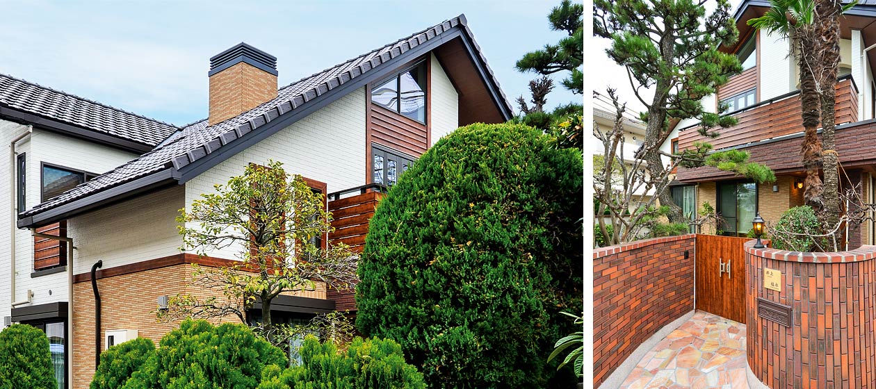 プレミアム仕様タイルや木調モールディングで洋館風に仕上げた外観。チムニー(煙突)もあしらいました。 既存の塀を活かしつつ、雰囲気や高さを合わせて門扉を新設。門灯と乱形石貼りの床が華やかにご家族やゲストを迎えます。