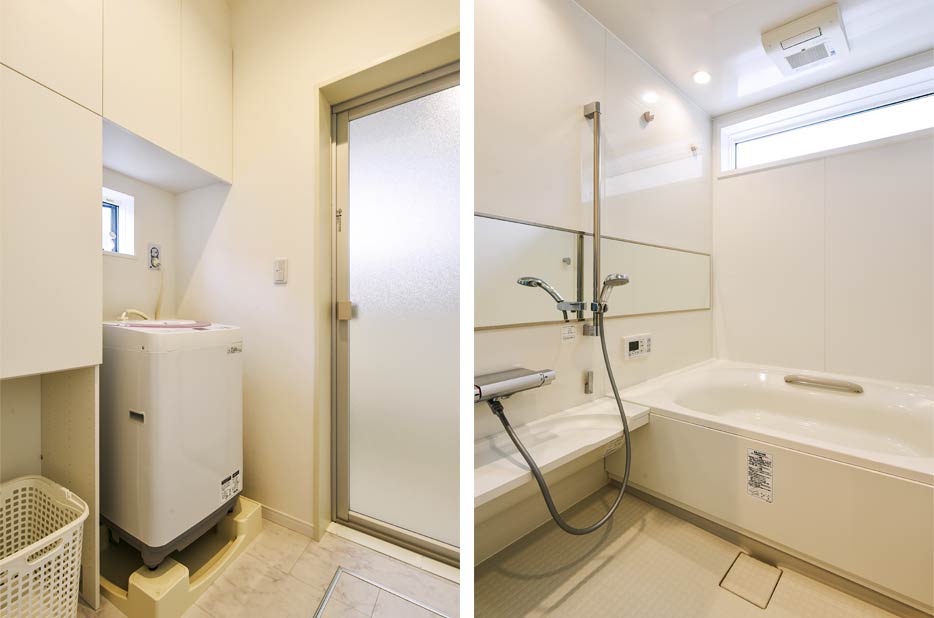 洗面室と分けて設けた脱衣室は収納が充実。1620サイズの浴室。横長の姿見や窓を採用。