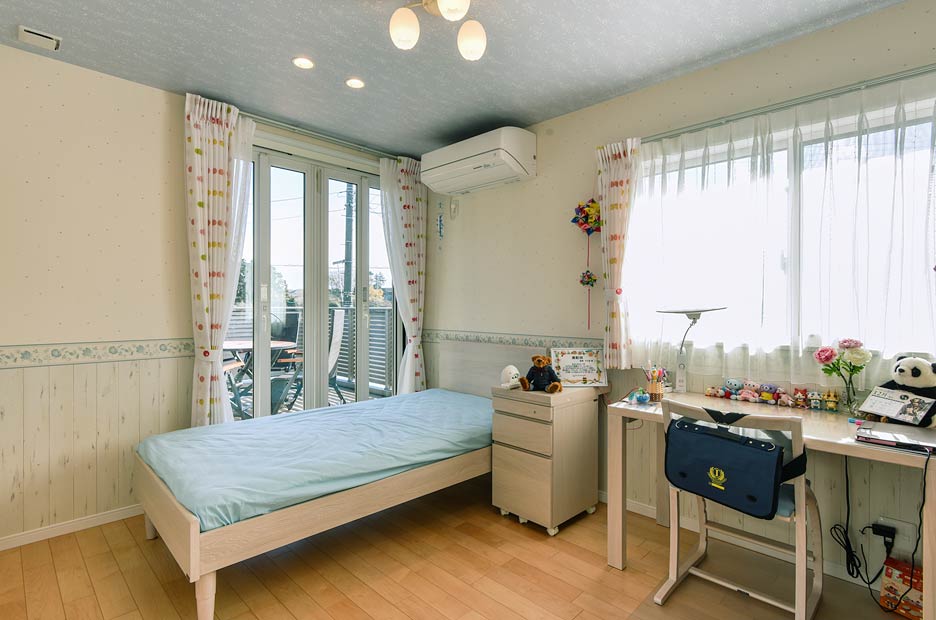 壁は腰板風クロス、天井は暗くなると星が現れる蓄光性クロスを採用。バルコニー側は折れ戸を全開可能。