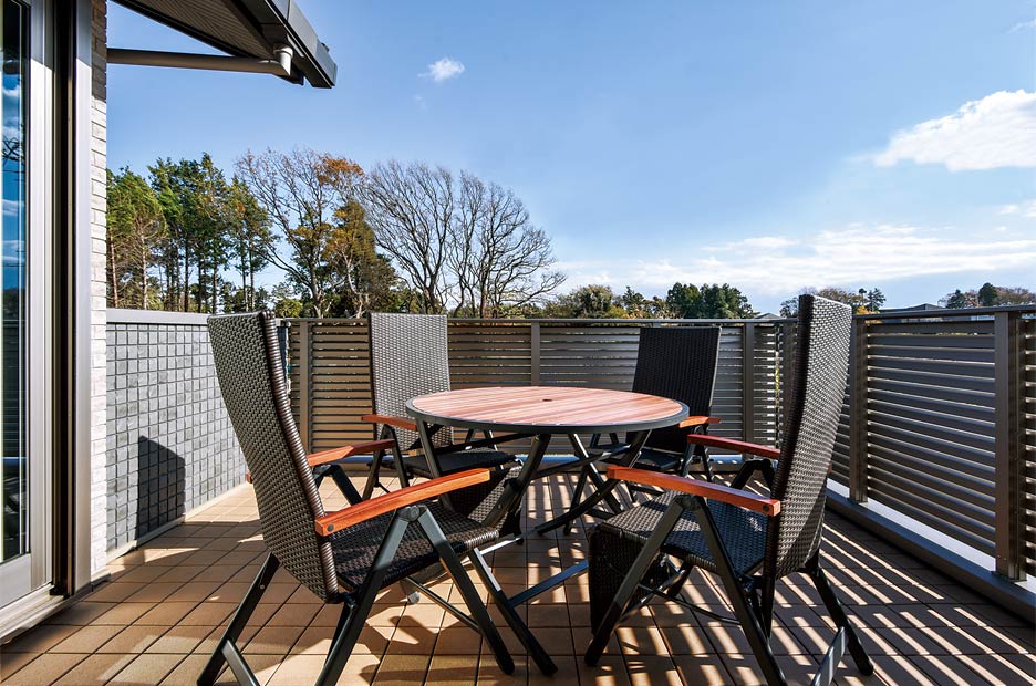 2階に約8帖分の広さを確保した防水仕様のバルコニーは、庭の眺めや周囲の景色を見晴らせる憩いの場。気候が良い季節にはカフェ気分で開放的にくつろげます。