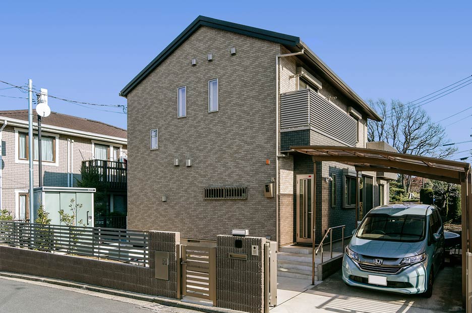 西側には勝手口とご家族用のアプローチを設けました。カーポートも併設しています。