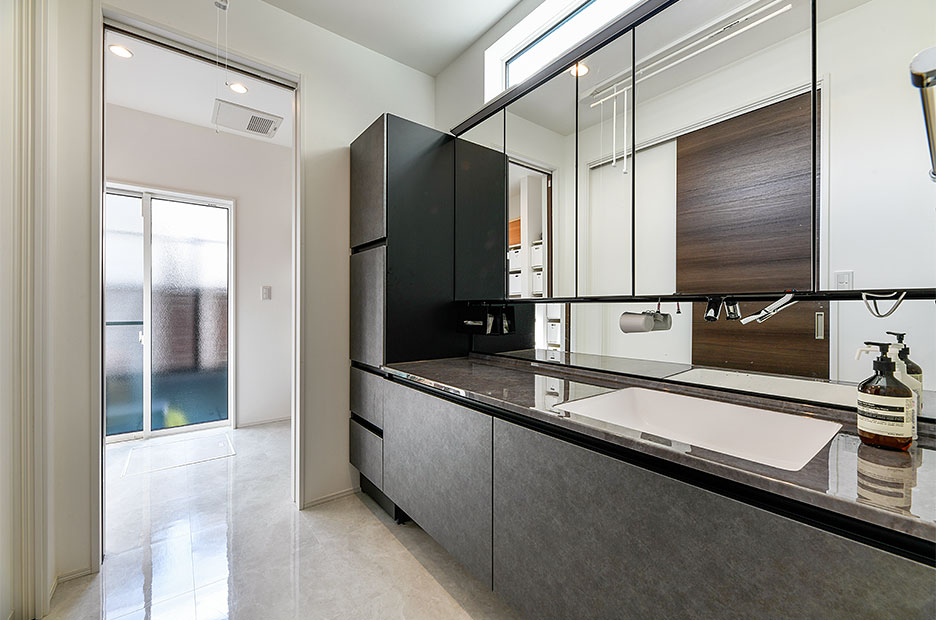 ゆったりとした洗面室にはウォークインパントリーを併設。