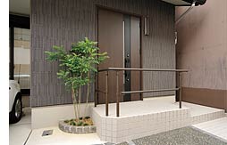 駐車スペースと分けた、角タイル敷きのアプローチ。 ステップとL字形で描かれた動線が、訪れる人を縦割りタイル壁が美しい玄関までゆったりと招き入れます。 |