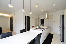 「お友達と一緒に楽しく料理がしたい」「お子様を見守りながら家事がしたい」「将来は子どもと並んで料理がしたい」との奥様の希望で、アイランド型キッチンを採用。システムキッチンとダイニングテーブルは同じ素材で統一感を持たせ、床はホワイトの光沢のあるタイル調フローリングに。