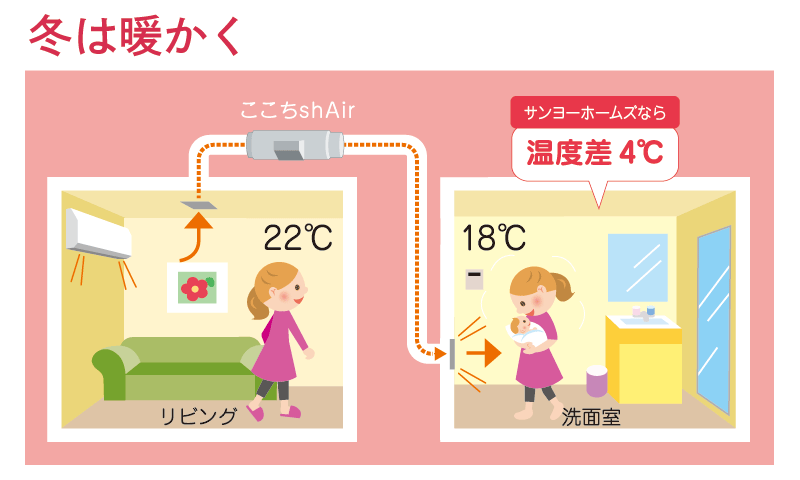 リビング等で快適温度に調整された空気をエアコンのない脱衣室(洗面室)に送風するシステム。リビングと脱衣室で快適温度をシェアすることにより、夏は脱衣室がいつでも涼しくなり、のぼせや脱水を解消し、冬はいつでも暖かくなり、湯冷め対策をすることで、温度バリアフリーに貢献。また、センサーによる自動運転のため、誤操作を防ぎ、子どもにやさしい入浴環境を実現します。
