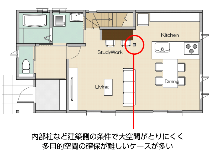 家族とのコミュニケーションを重視する傾向が高まる中、多目的に使えるLDKとしての広さを求められることが増えています。しかしながら、今までは多目的化したリビングに応えることができる構造ではなく、不要な柱や壁がその実現への壁となっていました。