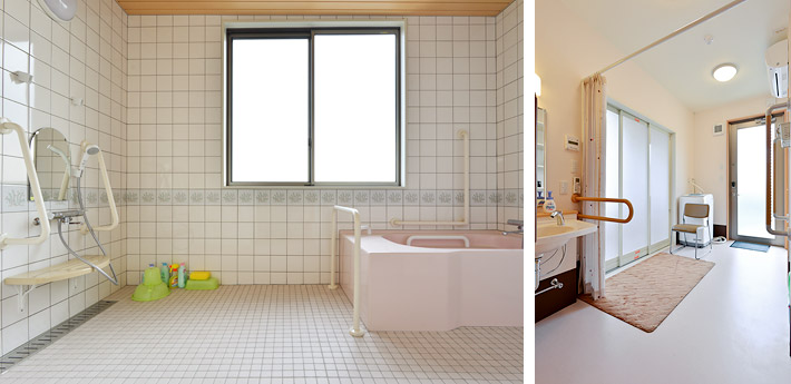 | 共用の浴室は南北2ヵ所に用意。 洗い場を広くしたこちらのタイプは、車椅子でも余裕をもって利用できます。 |