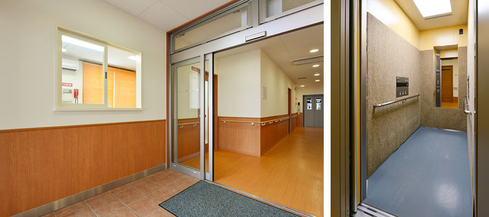 | エレベーターはストレッチャーがそのまま載せられる奥行きを確保。 |
