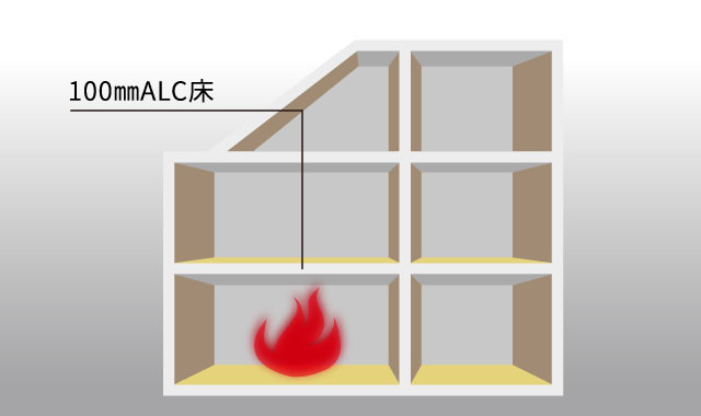 耐火性に優れた外壁と同様、室内の床下に厚さ100mmのALC床パネルを採用。建物内の燃え広がりを抑えるだけでなく、隣家への延焼防止にも効果を発揮します。